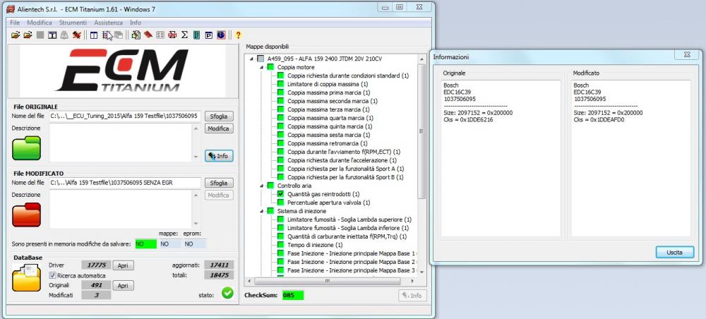 Salve. Ho una centralina alfa 2.4 jtdm edc16c39. Devo azzerare l'EGR. I file li ho preparati. Pero la Titanium non mi corregge la checksum. Il Driver l'ho trova. Anche modificando il file e salvandolo non mi corregge la checksum. E un problema del mio programma, oppure qualcuno avuto problemi simili? File: 1037506095, Driver A459_095, Cks = 0x1DDE6216 File modificato: 1037506095, Driver A459_095, Cks = 0x1DDEAFD0