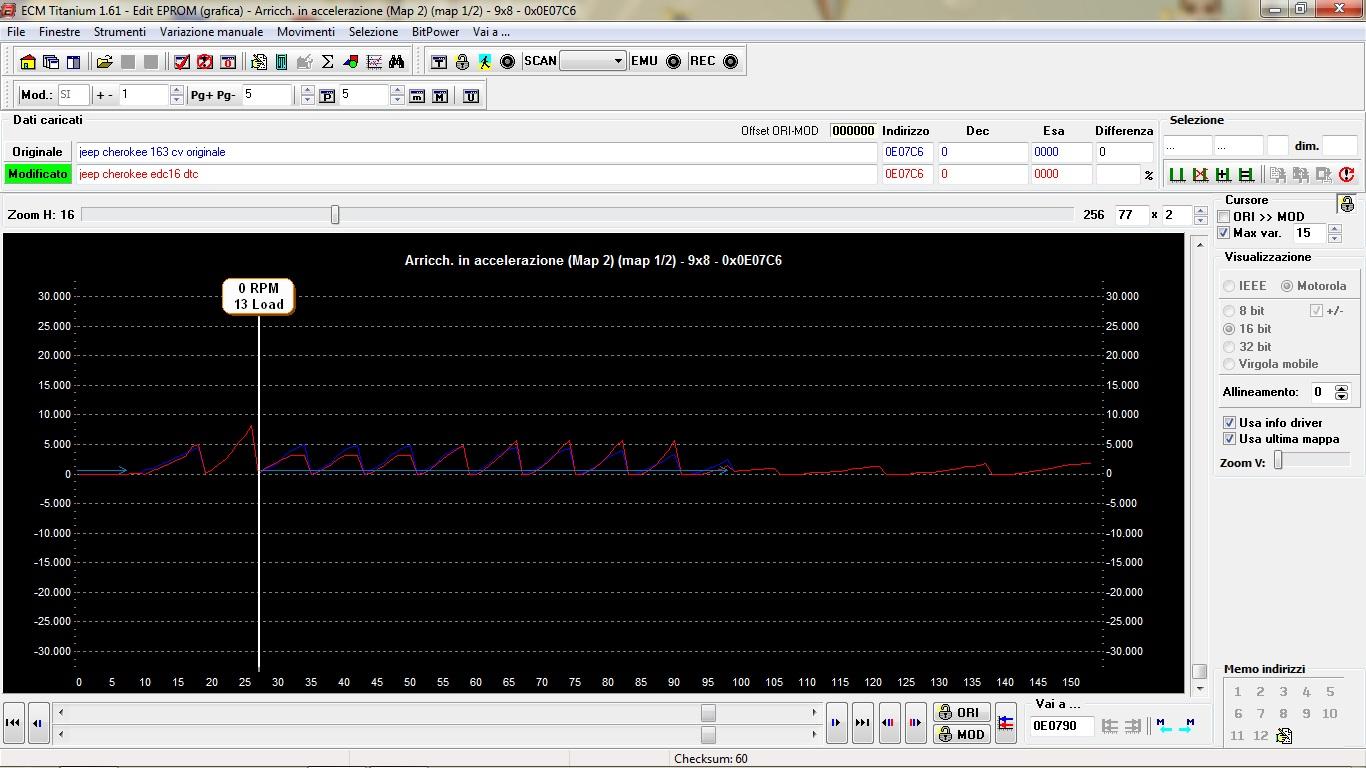 Salve a tutti, mi trovo qua a chiedervi un parere ho per le mani la mappa mod di un jeep cherokhee che sto cercando di riportare il più possibile originalie.. la sto confrontando con una mappa originale trovata in rete con diversa versione software ( purtroppo la sua non si trova ) utilizzando ECM in 2d con i driver Jxxx_809 riconosciuto sul file trovato in rete. Partendo dal presupposto che sono entrambe della stessa macchina 2.8 163cv e stessa centralina, con versione software diversa generalmente dovrebbero cambiare gli indirizzi delle varie mappe.. Credo, correggetemi se sbaglio.. Ma ogni singola mappa di per se dovrebbe essere simile con dei breakpoint identici tra i due file, quindi confrontandole dovrei riuscire a rintracciare tutte le mappe sfruttando i breakpoint nonostante la differenza di software tra i due file giusto? Non so se sia un caso, ma tra l'altro gli indirizzi tra queste due versioni mi sembrano praticamente identici, è possibile? Aggiungo qualche foto per esempio: Partite dal presupposto che son tutte deduzioni logiche di un principiante Grazie jeep cherokee 163 cv originale jeep cherokee edc16 dtc -