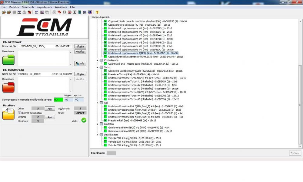10. Premetto che parlo di ECM Titanium originale. Se il file ori non è integro ecm non trova i driver relativi, anche se hai modificato un solo bit. Se ecm non trova i driver le motivazioni sono solo due: - file ori non integro o driver mancante del database Alientech. Se il driver viene trovato, si deve essere compatibile, ma per esserlo deve essere totalmente ori che io sappia. Purtroppo ho cercato ovunque il file ori della mia versione, ma non è disponibile da nessuna parte. Tra l'altro questo modello di auto con questa centralina è presente tra i protocolli obd del Kess, con cui è stata letta.